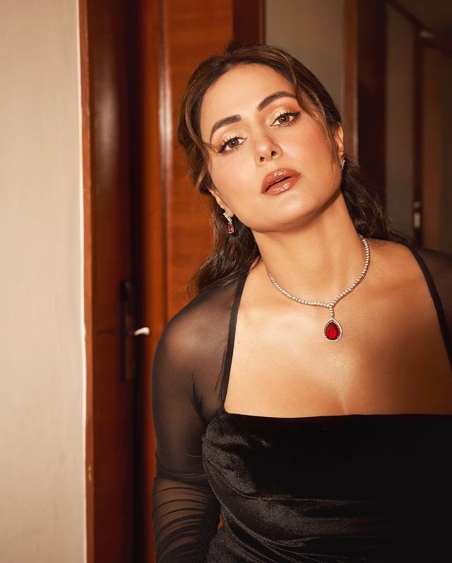 ગ્લોસી મેકઅપ સાથે હિના ખાને તેના વાળ ને હાફ પોની માં બાંધ્યા છે અને વાળ માં બ્લેક રીબીન પણ બાંધી છે.
