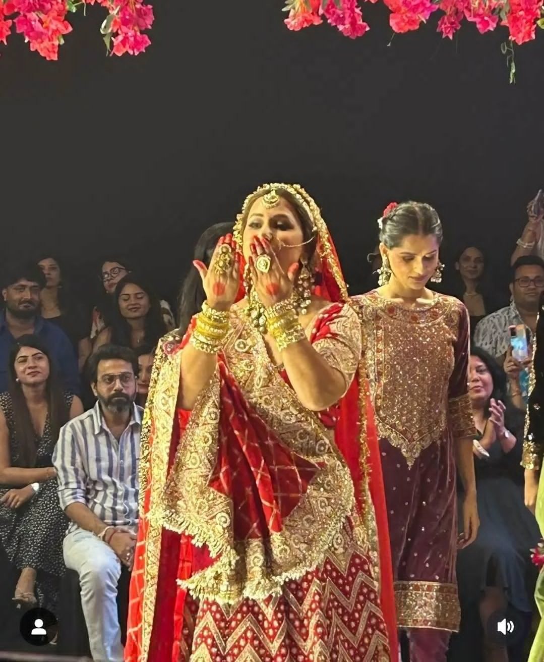 આ દરમિયાન હિના ખાને લાલ આઉટફિટ માં દુલ્હન ના રૂપ માં રેમ્પ પર વોક કર્યું હતું.