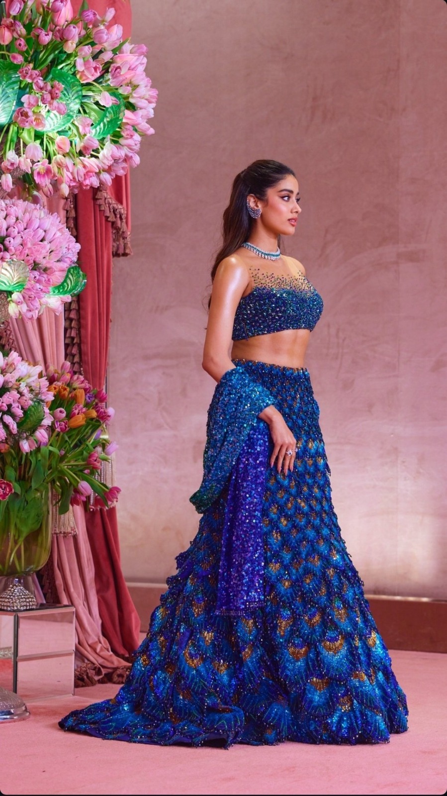 જ્હાન્વી કપૂરે રોયલ બ્લુ રંગના એ-લાઇન લહેંગાને નેકલાઇન બ્લાઉઝ સાથે પેર કર્યો હતો.