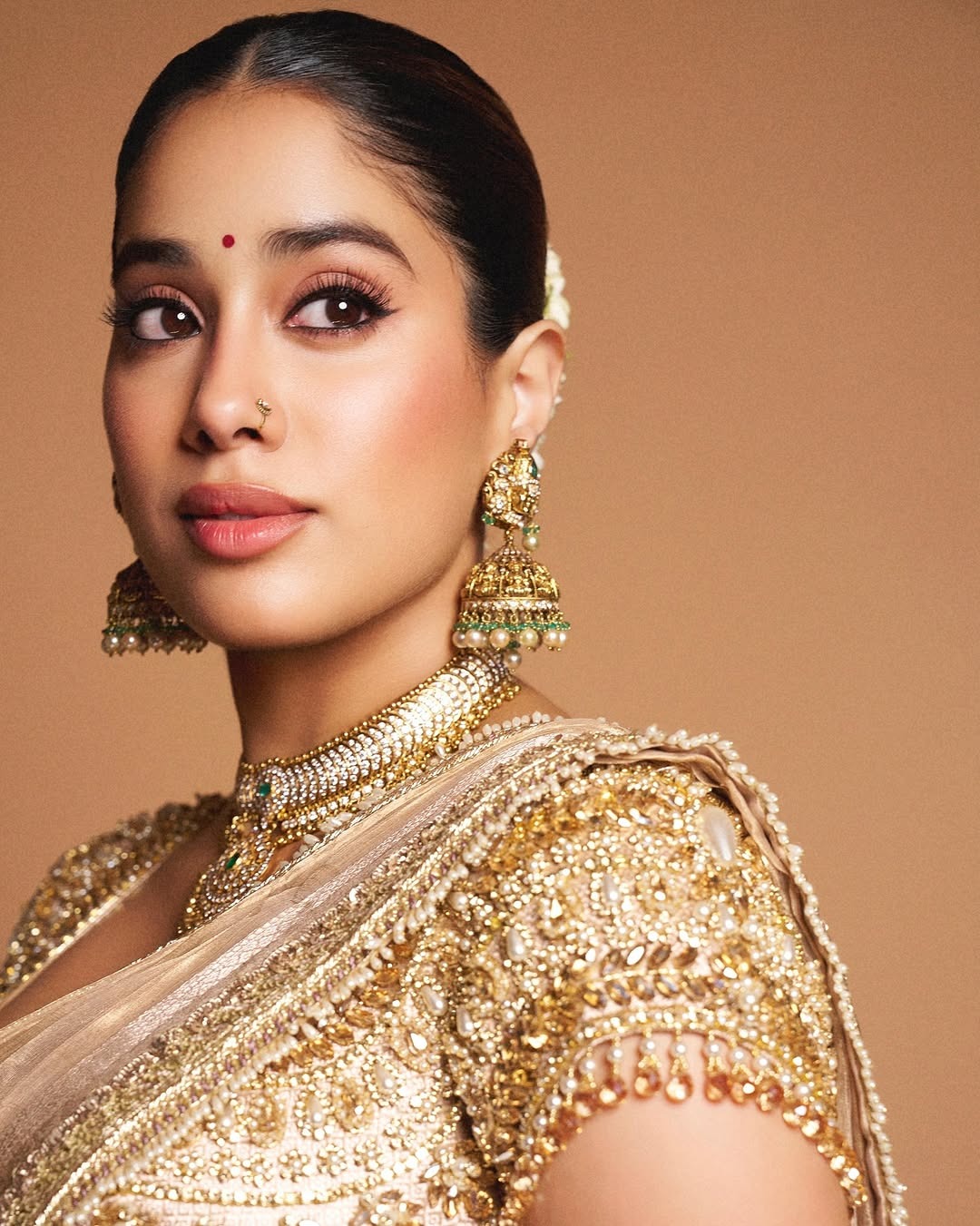 જાહ્નવીએ સોનેરી સાડી સાથે ભારે ઘરેણાં પહેર્યા છે. જે તેની સુંદરતા માં વધારો કરી રહ્યા છે.