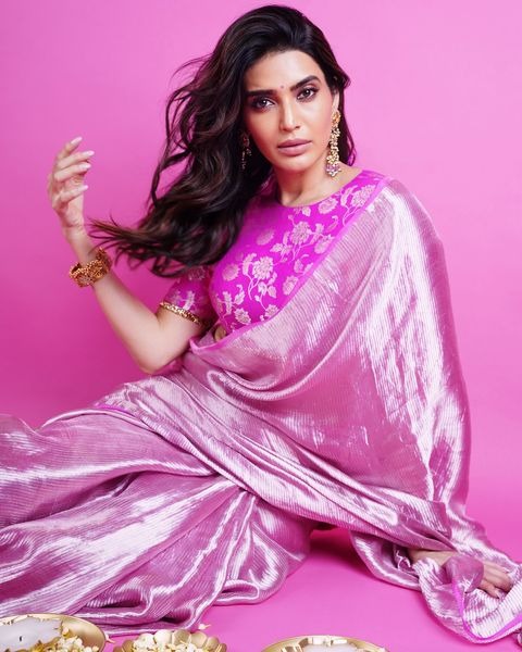આ તસવીરો માં કરિશ્મા પિન્ક ઓર્ગેન્ઝા સાડી માં જોવા મળી રહી છે.