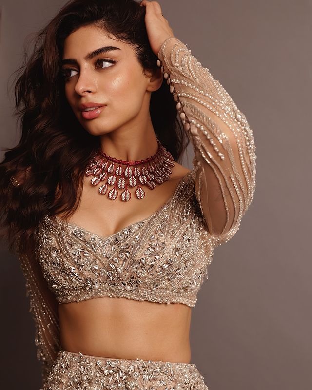 ખુશી કપૂરે સિલ્વર ફિશટેલ લહેંગા સાથે ફૂલ સ્લીવ્ઝ નું મેચિંગ બ્લાઉઝ પહેર્યું હતું.