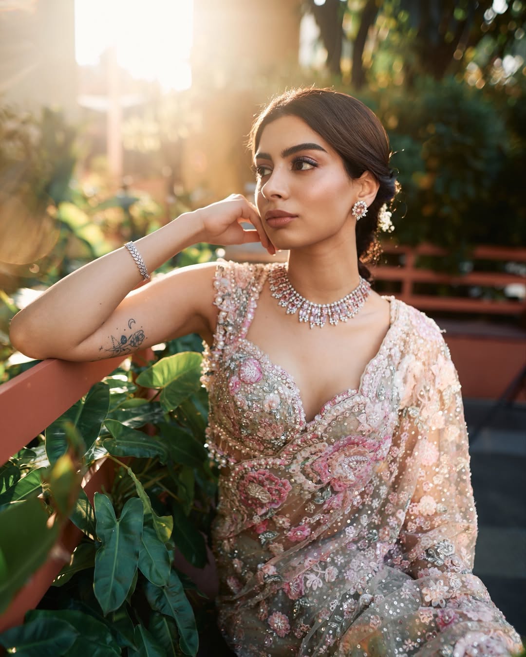 સાડી સાથે ખુશી એ હેવી ડિઝાઇનર બ્લાઉઝ કેરી કર્યો છે, જેના બેક ડિઝાઇનમાં મોતીના લટકન છે