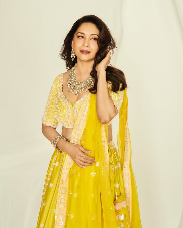 આ તસવીરો માં માધુરી યલો લહેંગા ચોલી માં ખુબ જ સુંદર જોવા મળી રહી છે.