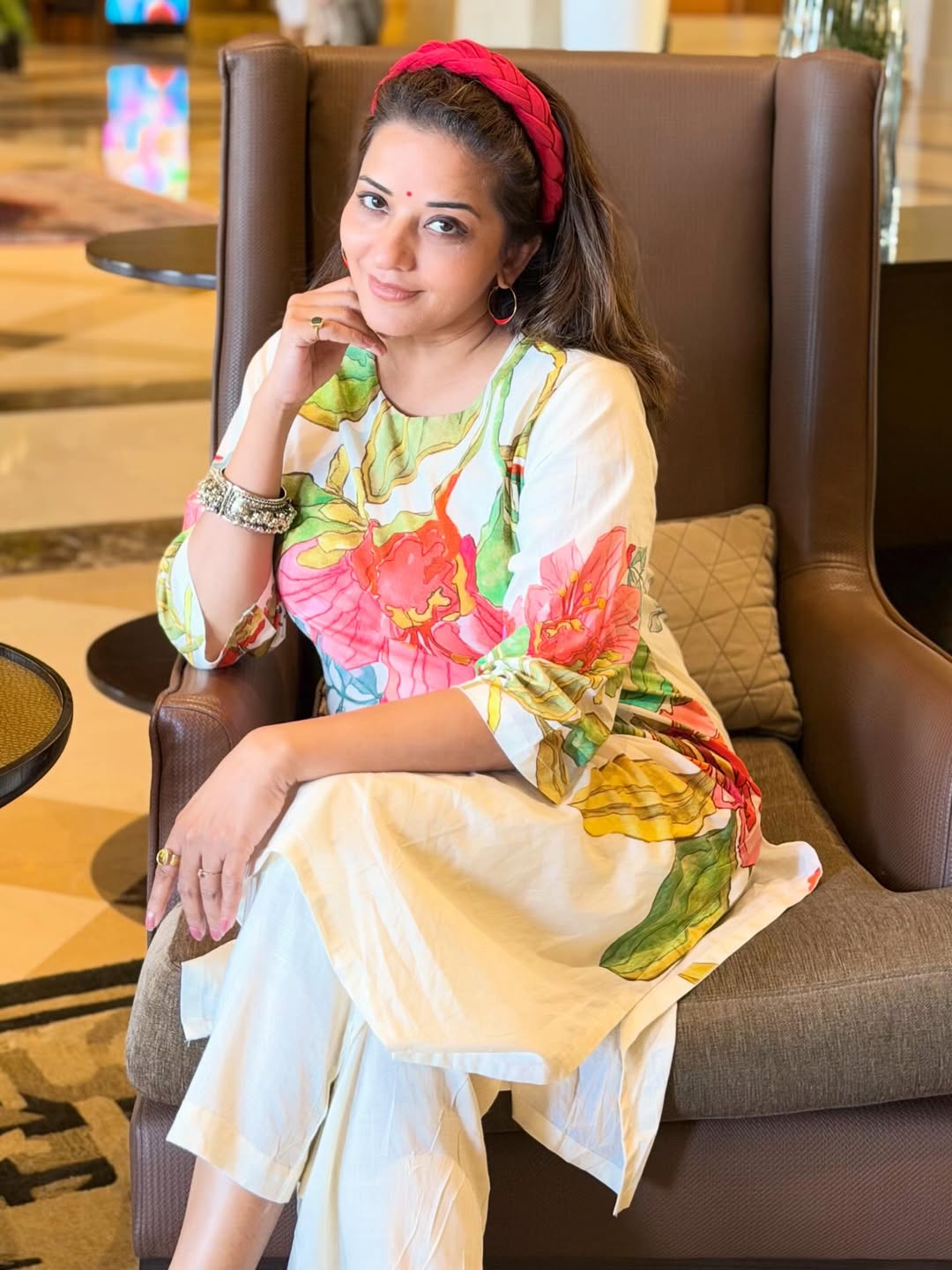 પોતાના લુકને કમ્પ્લીટ કરવા માટે મોનાલિસાએ કપાળમાં લાલ બિંદી અને માથામાં લાલ હેરબેન્ડ પહેરી છે