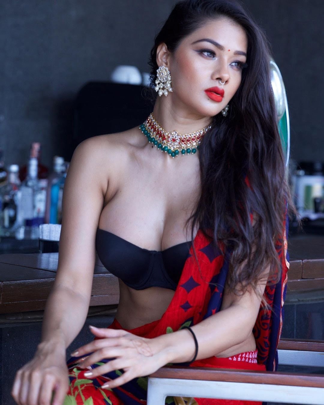 લેટેસ્ટ ફોટો માં નમ્રતા મલ્લાએ રેડ પ્રિન્ટેડ સાડી પહેરી છે, જેની સાથે તેણે બ્લેક બ્રેલેટ પહેર્યું છે.