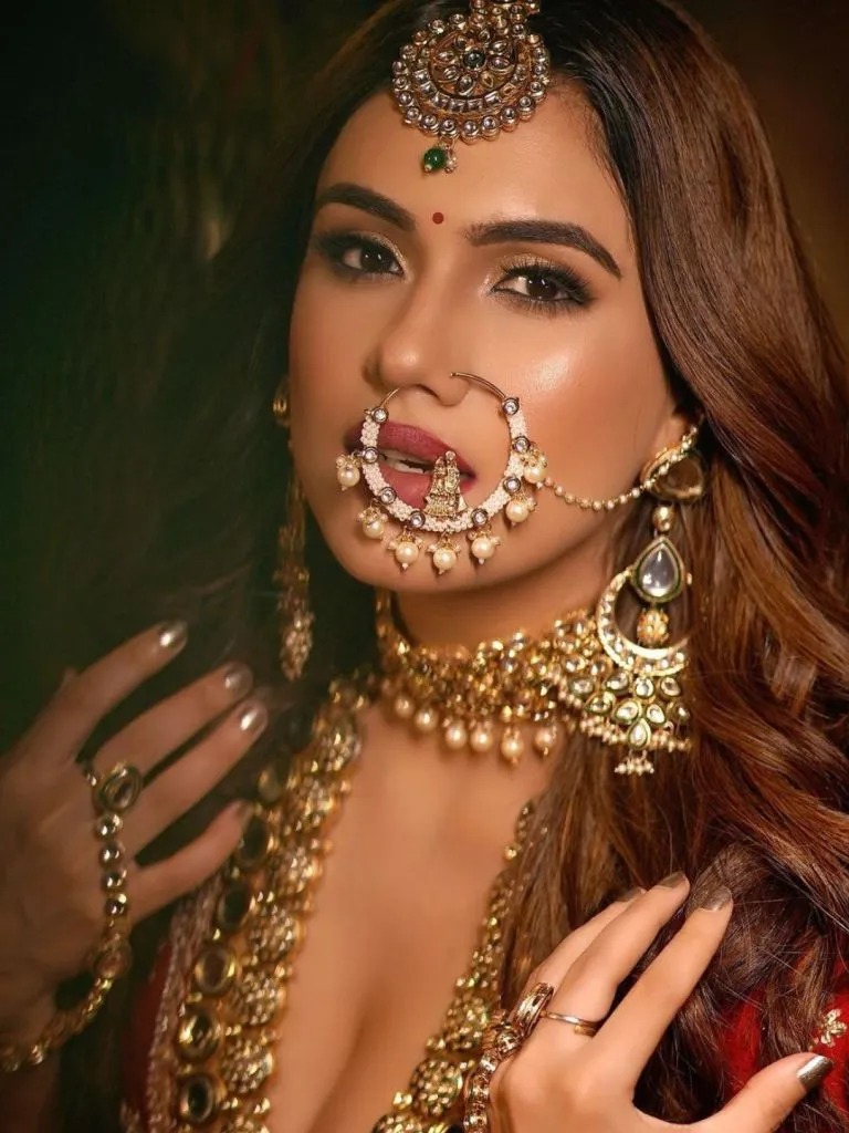 નેહા મલિકે તેના બ્રાઇડલ લુક ને ટિકલી, નથ અને નેક પીસ સાથે એક્સેસરીઝ કર્યો હતો
