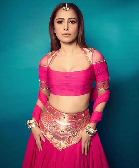 નુસરત ભરૂચા સ્ટાઇલિશ ગુલાબી રંગનો લહેંગા પહેરેલી જોવા મળી રહી છે.