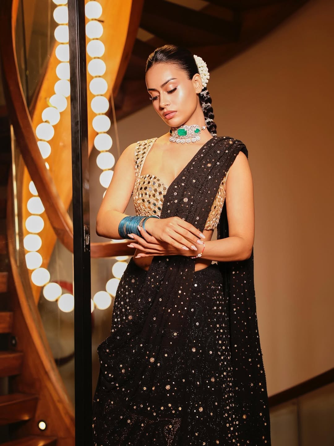 ન્યાસા એ  કાળા લહેંગાને ગોલ્ડન વર્ક સાથે ગોલ્ડન સ્લીવલેસ બ્લાઉઝ સાથે જોડી દીધો છે