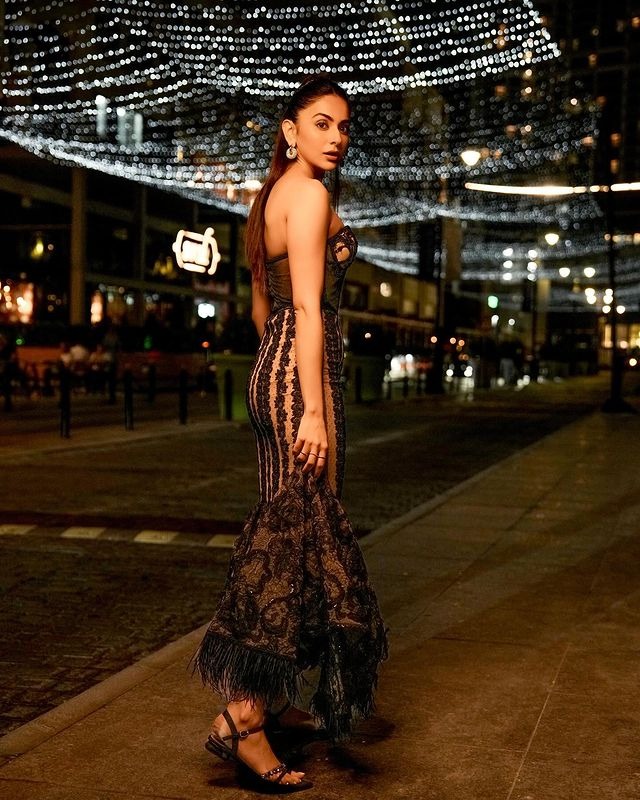 રકૂલ પ્રીત સિંહ એ સ્લીવ બ્લેક નેટ ગાઉન પહેર્યું છે.