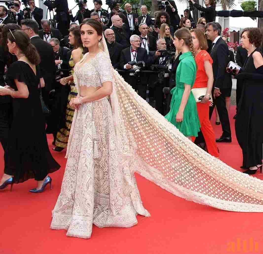 સારાનો લાંબો દુપટ્ટો કાનની રેડ કાર્પેટ પર લહેરાતો હતો, જેને તેણે પિન કર્યો હતો.