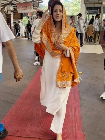 આ દરમિયાન શહેનાઝ ગિલ સિમ્પલ સલવાર સૂટ માં જોવા મળી હતી અને તેને માથા પર દુપટ્ટો ઓઢ્યો હતો
