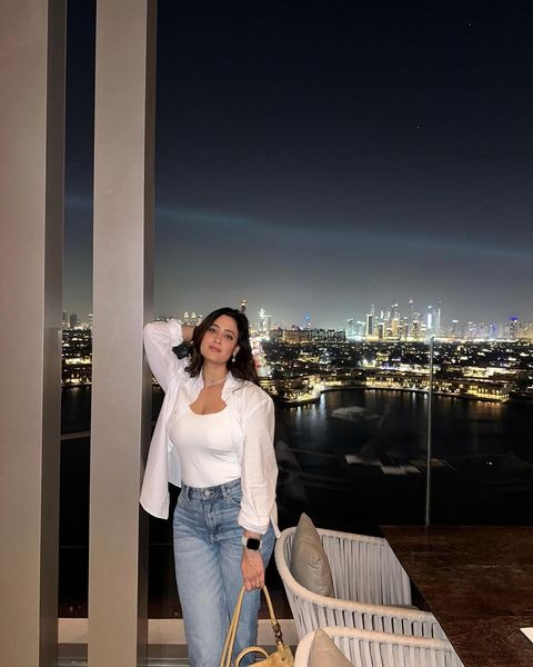 આ દરમિયાન શ્વેતા વ્હાઇટ ક્રોપ ટોપ, વ્હાઇટ શર્ટ અને ડેનિમ માં ખુબ જ સુંદર લાગતી હતી.