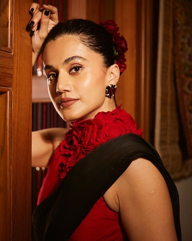 આ સાડી સાથે તાપસી એ લાલ રંગ નું બ્લાઉઝ પહેર્યું છે જે તેનું સુંદરતા માં વધારો કરી રહ્યું છે.