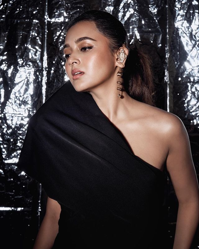 આ તસવીરો માં તેજસ્વી બ્લેક થાઈ હાઈ સ્લીટ ગાઉન માં જોવા મળી રહી છે.