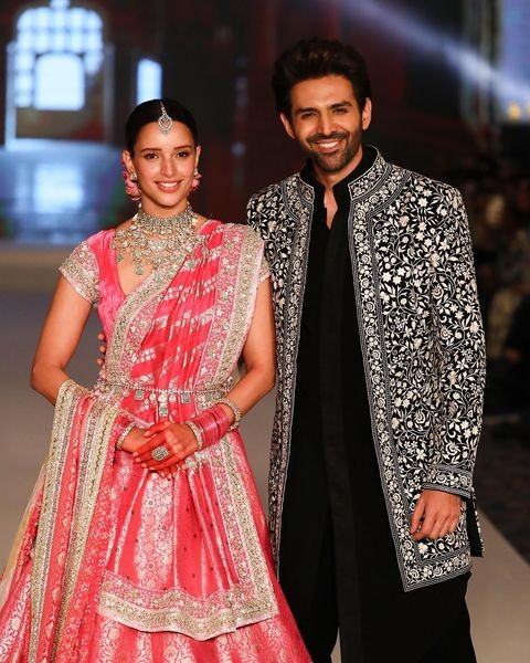 કાર્તિક આર્યને બ્લેક શેરવાની સાથે સફેદ વર્ક કોટ પહેરીને મનીષ મલ્હોત્રા માટે રેમ્પ વોક કર્યું હતું