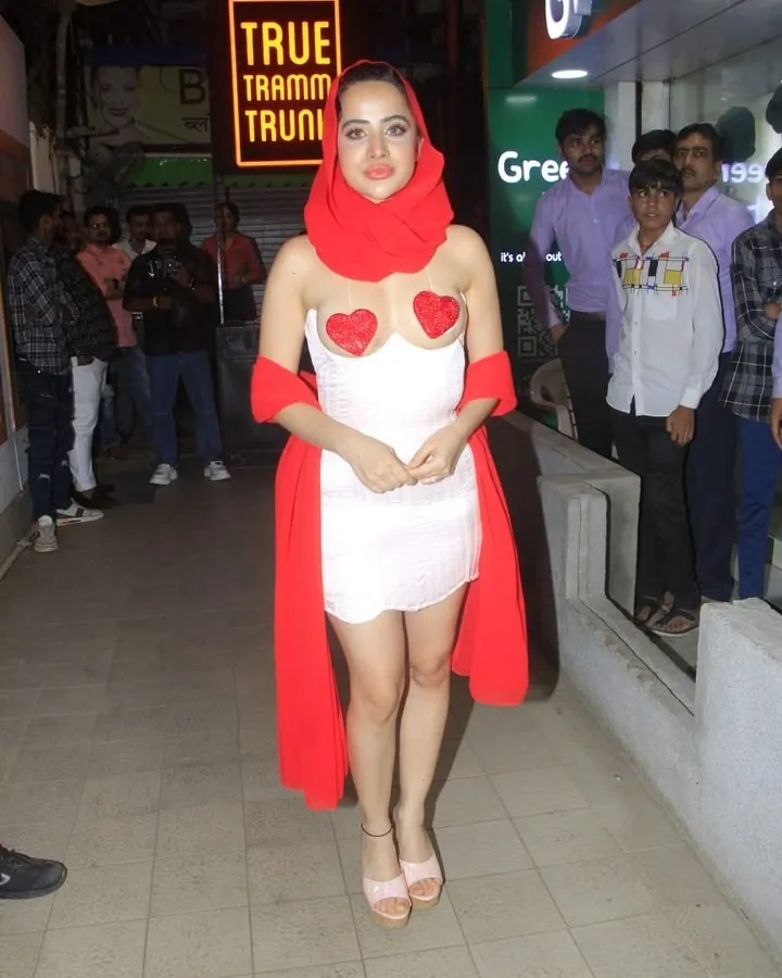 આ ફોટામાં, ઉર્ફીએ આગળથી સફેદ ટ્યુબ ડ્રેસને કટ કર્યો છે અને બ્રાની જગ્યાને ઢાંકવા માટે તેને 2 લાલ હૃદય લટકાવી દીધા છે